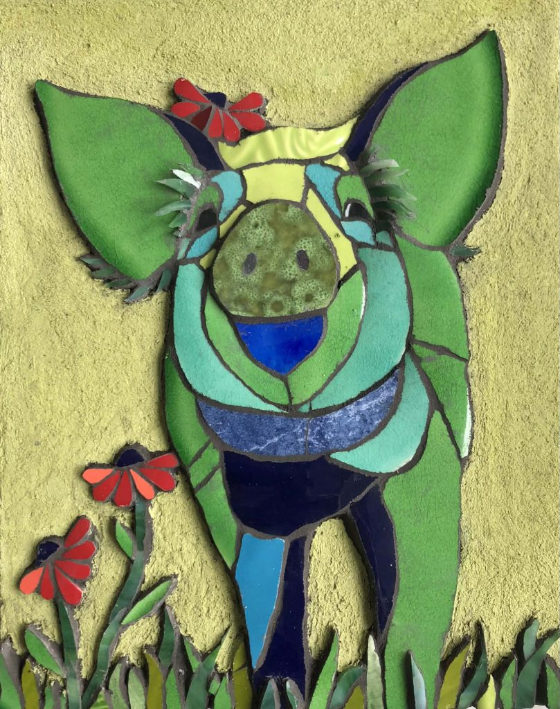 Anne Bjørkmann har skabt denne skønne glade grønne gris i mosaik🐷💚 Spørgsmålet er hvem, skal have den skønne gris hængende for kærligt at minde om, at grisene i vores varetægt skal have det grønneste omsorgsfulde griseliv i verden? 💚🐷🌱